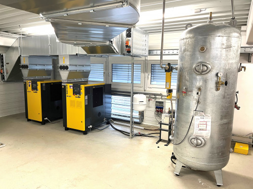 Bereits in 2022 wurde unsere Kompressoranlage erneuert und mit zwei wichtigen Komponenten ausgestattet. Einmal erlaubt uns der montierte  Luftkanal mit der entsprechenden Klappensteuerung jahreszeitabhängig die warme Kompressorluft entweder ins Freie, oder zur Beheizung der Produktionshallte in die Halle, zu leiten. Das noch wichtigere Bauteil ist jedoch der Wärmetauscher, der dem Kühlöl des Hauptkompressors die Wärme entzieht und diese in die Warmwasserspeicher der Heizungsanlage abgibt. Somit konnten wir unsere 2.000 m² (10.300m³ umbauter Raum) im Winter 2022/2023 zu über 96% ohne Heizung beheizen. Bei Temperaturen unter -7° mussten dann die beiden Wärmepumpen zur Beheizung des Gebäudes unterstützend eingreifen, mit 192 kWh im kompletten Winter aber mehr als überschaubar. Durch den "milden" Winter gab es an vielen Tagen sogar einen Wärmeüberschuss.